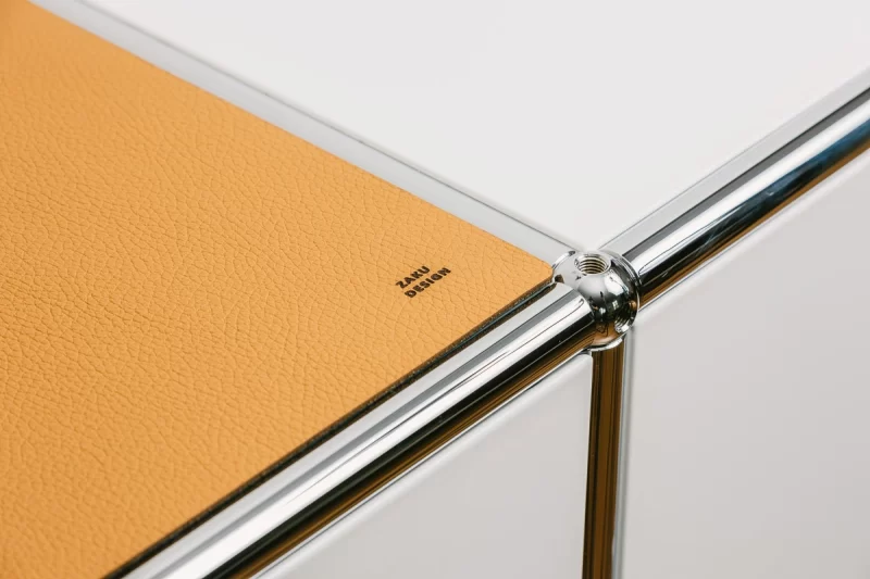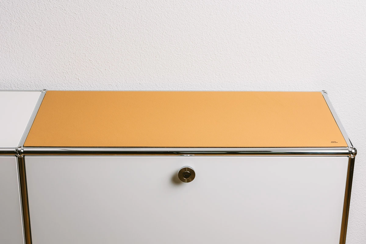 Die Ecken sind mit einem Radius versehen um den Abschluss an der USM Kugel formschlüssig zu vollenden. Die Oberflächenstruktur des eleganten Leders wurde so ausgewählt das die Form und die Haptik zu den USM Haller Systemmöbeln übereinstimmt.