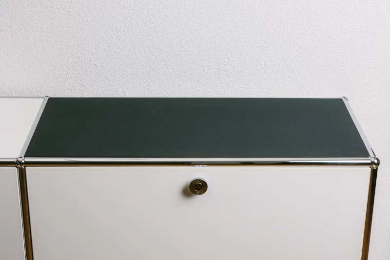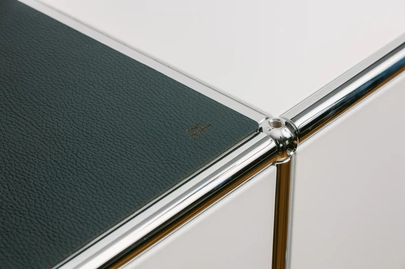 Die Ecken sind mit einem Radius versehen um den Abschluss an der USM Kugel formschlüssig zu vollenden. Die Oberflächenstruktur des eleganten Leders wurde so ausgewählt das die Form und die Haptik zu den USM Haller Systemmöbeln übereinstimmt.